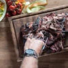 Bringen sie die Gusseisen Grillpresse zunächst auf dem Grill auf Temperatur und legen sie diese dann auf das Pattie. Dabei bringt das massive Material genügend Gewicht auf die Waage, um das Hackfleisch-Pattie flach anzudrücken.