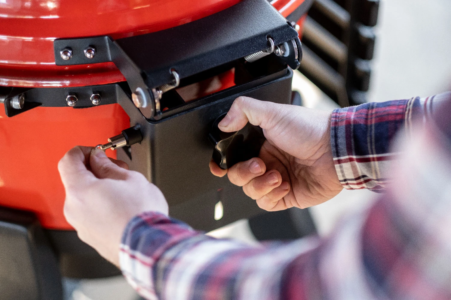 Der Kamado Joe Kettle Joe besitzt ein Federdeckelscharnier, welches für ein einfaches Öffnen und Schließen des Deckels ohne hohen Kraftaufwand sorgt. Damit der SloRoller Aufsatz verwendet werden kann, lässt sich der Deckel zusätzlich an der Rückseite des Scharniers durch eine Feststellschraube in der Höhe einstellen.