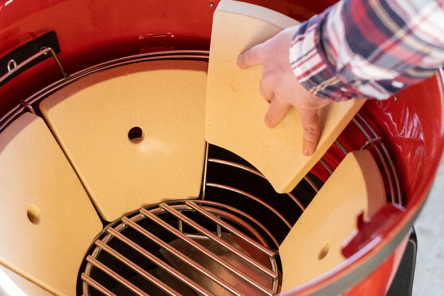 Im Innenbereich des Kessels befindet sich ein Edelstahl-Feuerkorb in dem die sechs Keramikelemente eingesetzt werden. Durch die Verwendung der Keramiksteine kann der Kettle Joe die Hitze besonders gleichmäßig und langanhaltend speichern und abgeben.