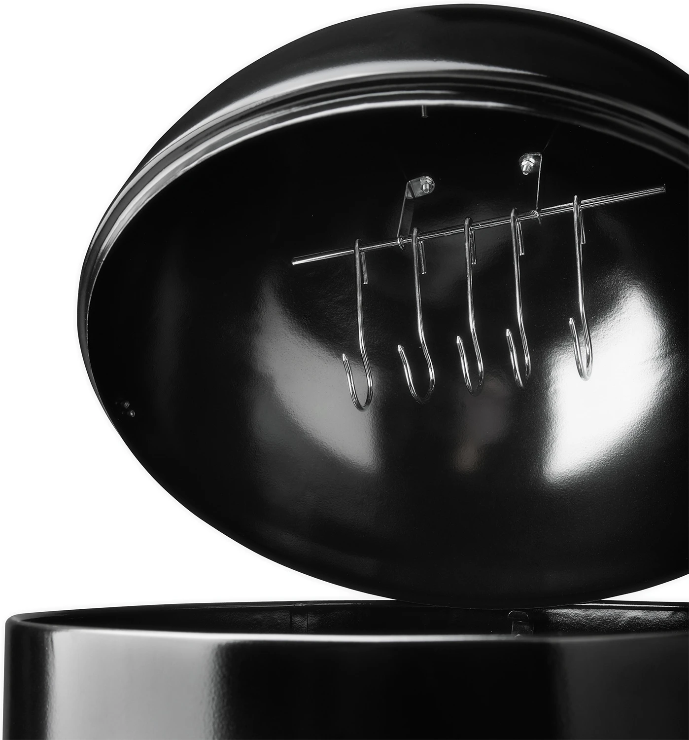 Auf dem Deckel ist zur leichten Handhabung ein stabiler Griff angebracht zum einfachen Anheben. Direkt im dem Deckel finden Sie ein Higlight des Apollo Smoker und Räucher Grills. Hier ist eine Stange mit 5 Fleischhaken eingearbeitet. An diesen Haken lassen sich hervorragend Würstchen, Fisch und anderes Räuchergut perfekt befestigen. Lassen Sie bei der Verwendung der Fleischhaken einfach den oberen oder auch zwei Grillroste weg, damit das lang aushängen und nicht liegt.