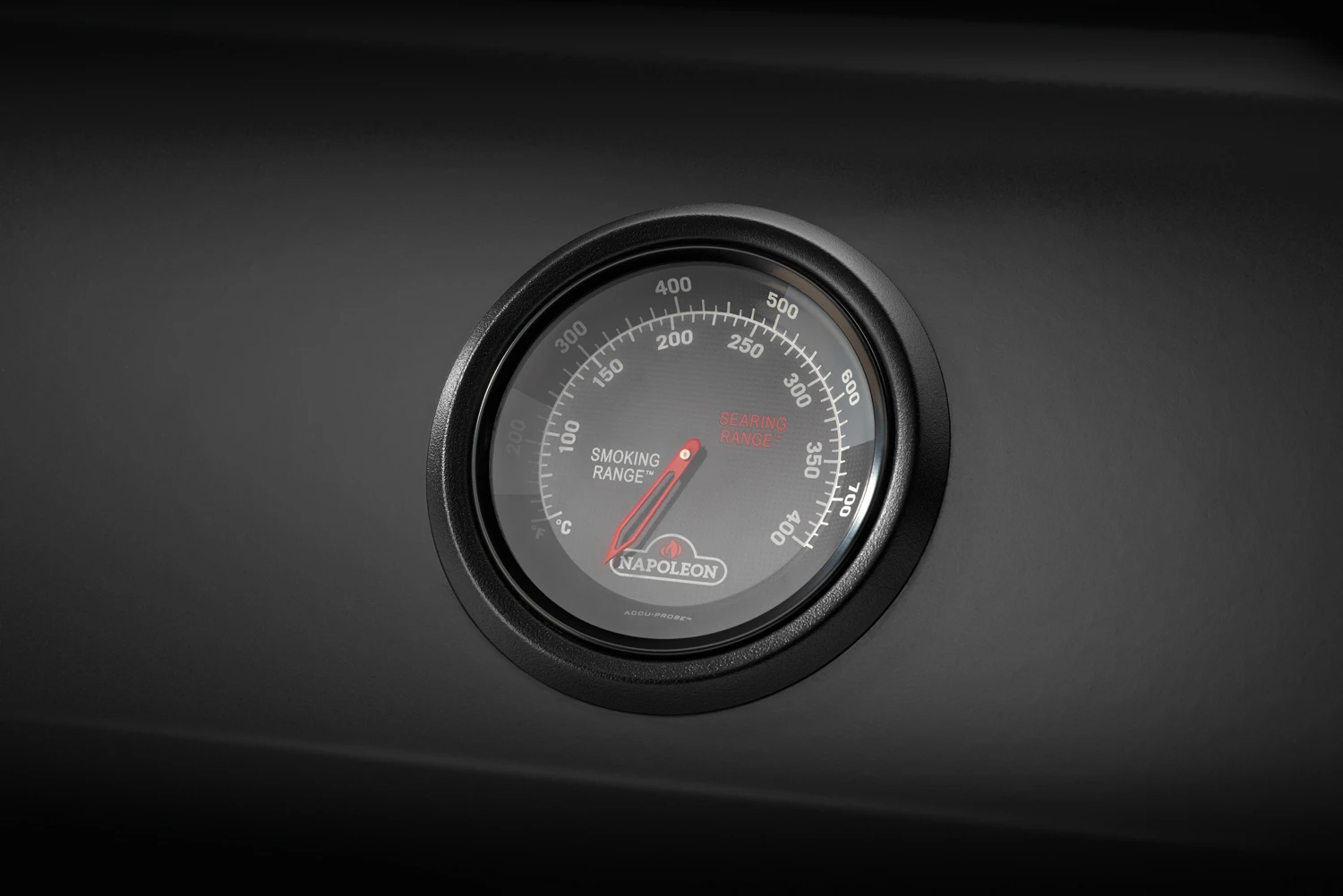 Das Deckelthermometer ACCU PROBE™ zeigt Ihnen zuverlässig die Garraumtemperatur an. Mit einer Skala von 40°C bis 370°C überwacht es den gesamten Temperaturbereich des Geräts.