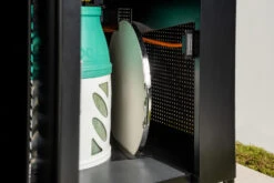 Der geräumige und durchdachte Unterbau mit leichtgängigen Rädern und einer Front-Tür mit Magnetverschluss kann eine Gasflasche aufnehmen und bietet zudem noch Platz für Zubehör. Die Seitentische können bequem abgeklappt und der Grill damit platzsparend verstaut werden. Weiterhin sind an den Seitentischen praktische Besteckhaken zu finden. Mit den höhenverstellbaren Standfüßen passen Sie die Arbeitshöhe bequem jedem Untergrund an.